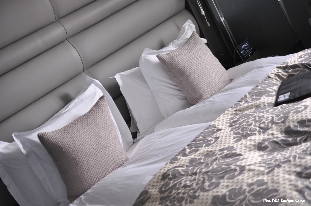 Arrivée sur les coups de 11h30, j’ai été accueillie par Léa et Morgane. En premier lieu, j’ai pris possession de ma chambre. Je suis tombée d’amour devant la décoration. Couleurs grise, anthracite, taupe ; mélange de rétro et de moderne avec de grands miroirs. Je m’y suis d’emblée sentie à l’aise. La salle de bain était sublime, sa baignoire très tentante! Sans oublier le joli balcon avec une superbe vue sur le lac.