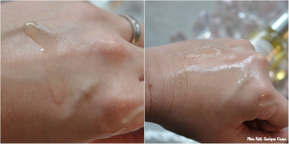 L’huile est légère et non-visqueuse. Une à deux gouttes suffisent pour l’ensemble du visage et cou. Son parfum est absolument délicieux. On y sent un délicat mélange de fleurs.