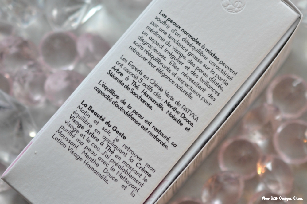 La Crème Visage Soin Équilibrant de Patyka vise à équilibrer les peaux normales à mixtes tout en stimulant leur compétences d’autodéfense. Sa composition naturelle contient deux huiles essentielles purifiantes : celle de Menthe Douce qui sera rafraîchissante, stimulante et tonifiante et celle d’Arbre à Thé qui sera décongestionnante et évacuera les toxines. Nous y trouvons aussi deux autres ingrédients rééquilibrants : l’eau florale d’Hammamélis avec ses vertus astringentes et apaisantes et l’Huile de Noisette qui régulera l’excès de sébum, resserrera les pores et combattra les points noirs.