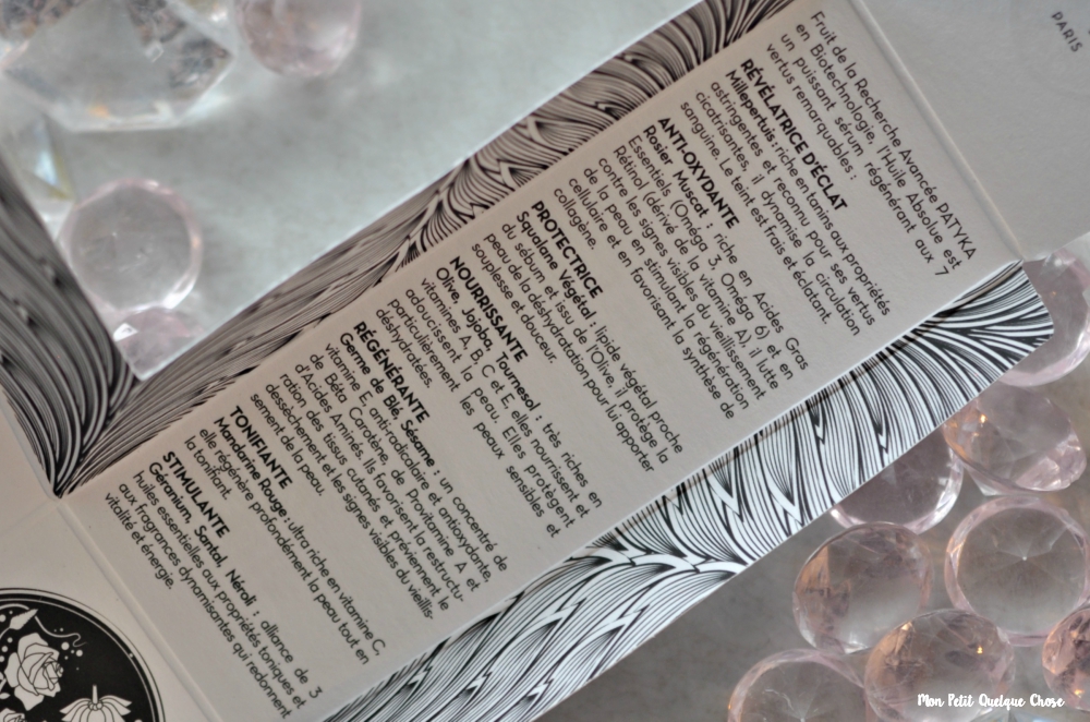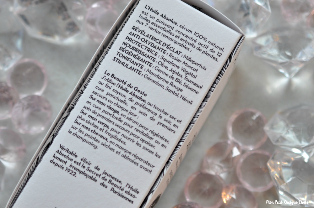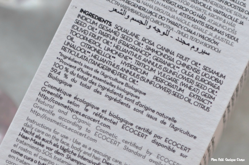Pour être plus précise, nous y trouvons des extraits de Millpertuis, de Rosier de Muscat, d’Olive, de Germe de Blé et de Mandarine rouge. Le tout va soutenir notre peau dans sa cicatrisation, sa production de collagène et sa régénération cellulaire. Celle-ci sera hydratée, nourrie, souple, éclatante et tonifiée. Les signes du vieillissement seront freinés.
