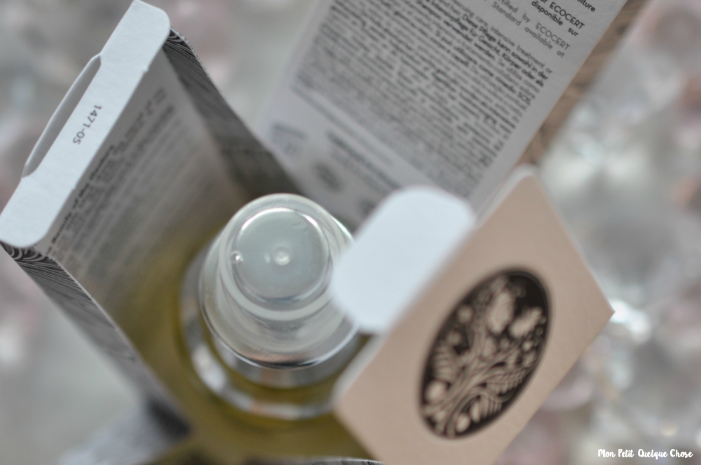Je l’utilise en guise de soin du soir. Bien qu’elle soit qualifiée de sérum, je l’applique seule sans y ajouter d’autres soins. Sa qualité suffit amplement à ma peau. À raison de deux gouttes, elle est quasi totalement absorbée (plus que le soin équilibrant). Ma peau est instantanément veloutée. Son parfum est très relaxant ce qui tombe bien pour un soin du soir. Le lendemain matin, ma peau est fraîche et confortable. Bien que ce soit une huile, ma peau la tolère très bien et je n’ai pas de soucis de points noirs.