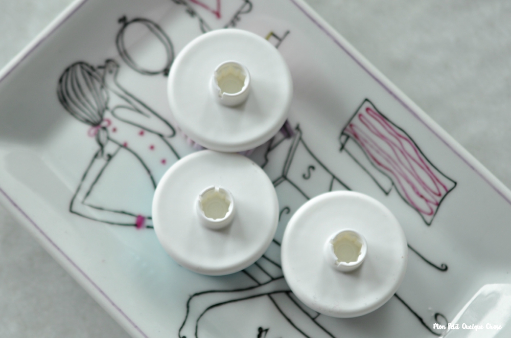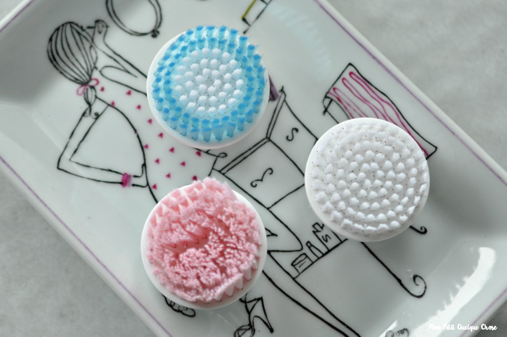 Les différentes brosses pour peaux normales (blanche), peaux sensibles (rose) et la brosse exfoliante (blanche et bleue) et l’éponge de beauté!