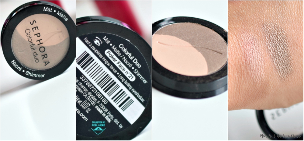 Ce petit duo de fards à paupière regroupe un fard mat et un fard nacré en un seul pan. Du coup, je me suis fait un makeup tout simple! Le fard nacré est très joli, c’est quasi un duochrome entre le doré et le kaki. Je l’ai posé sur l’ensemble de ma paupière mobile puis je l’ai estompé avec le fard mat. (CHF 12,50)